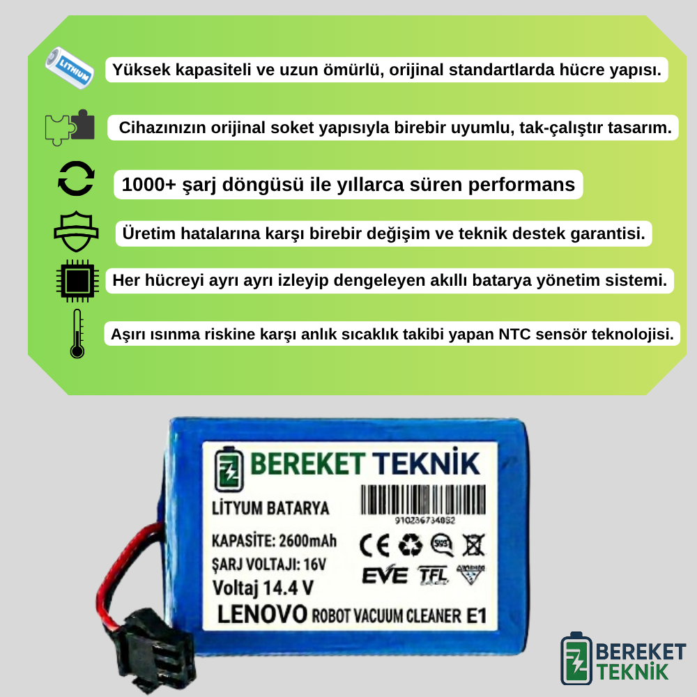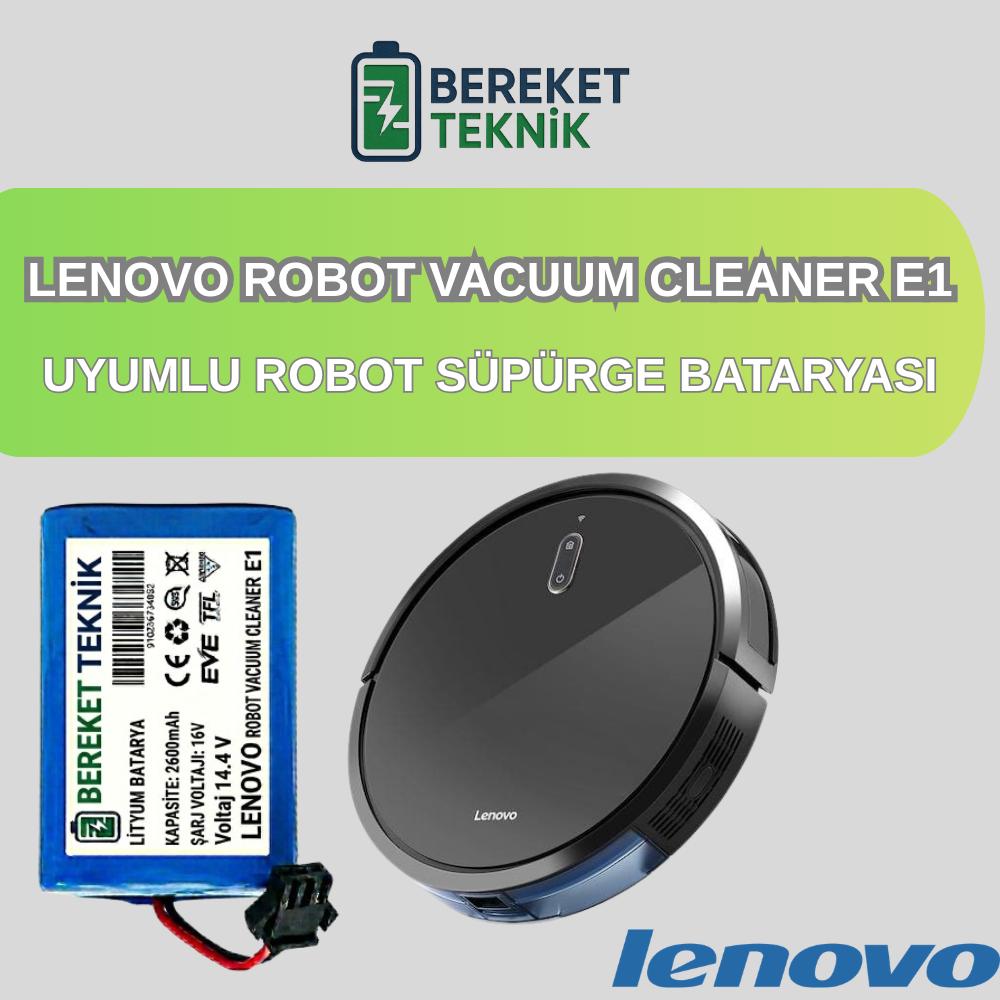 Lenovo Robot Vacuum Cleaner E1 robot süpürgenizle tam uyumlu, orijinal kapasitede (2600 mAh) yüksek performanslı batarya. Gelişmiş BMS kartı ve özel izolasyon malzemeleri ile güvenli kullanım sunar. Bereket Teknik güvencesiyle, üretici tarafından 2 Yıl Garantilidir.